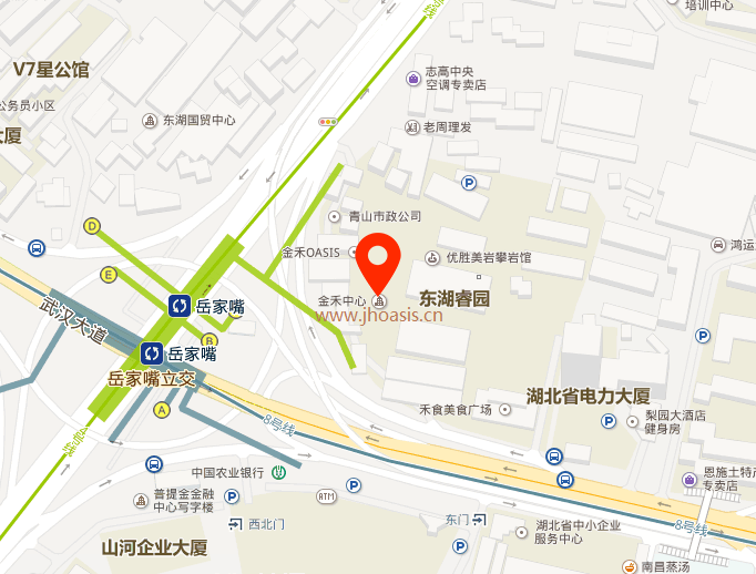 地址: 武汉市武昌区徐东大街191号 电话: 13971090313 手机: 13971090313 网址: www.jhoasis.cn 附近地铁站: 距离轨道交通4号线和8号线岳家嘴地铁站178米 附近公交站: 距离徐东大街地铁岳家嘴站 - 公交站 127米,途经公交车: yx315路 电8路 距离中北路地铁岳家嘴站 - 公交站 173米,途经公交车: 566路 618路 777路 782路 距离徐东大街省电力大厦 - 公交站 201米,途经公交车: 605路 距离徐东大街岳家嘴地铁站 - 公交站 292米,途经公交车: 348路 距离欢乐大道杨园南路 - 公交站 335米,途经公交车: 348路 810路 yx315路 距离徐东大街岳家嘴 - 公交站 461米,途经公交车: 102路 348路 530路外环 530内环 534路 577路 627路 702路 712路 723路 724路 yx315路 距离杨园南路欢乐大道口 - 公交站 506米,途经公交车: 348路 392路 581路 618路 810路 yx315路 距离徐东大街地铁梨园站 - 公交站 547米,途经公交车: 402路 552路 573路 601路 605路 709路 712路 810路 电8路